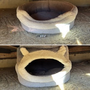 中にタイルカーペットをしいて、防水シートを敷いて、ざぶとんを入れて完成ー。